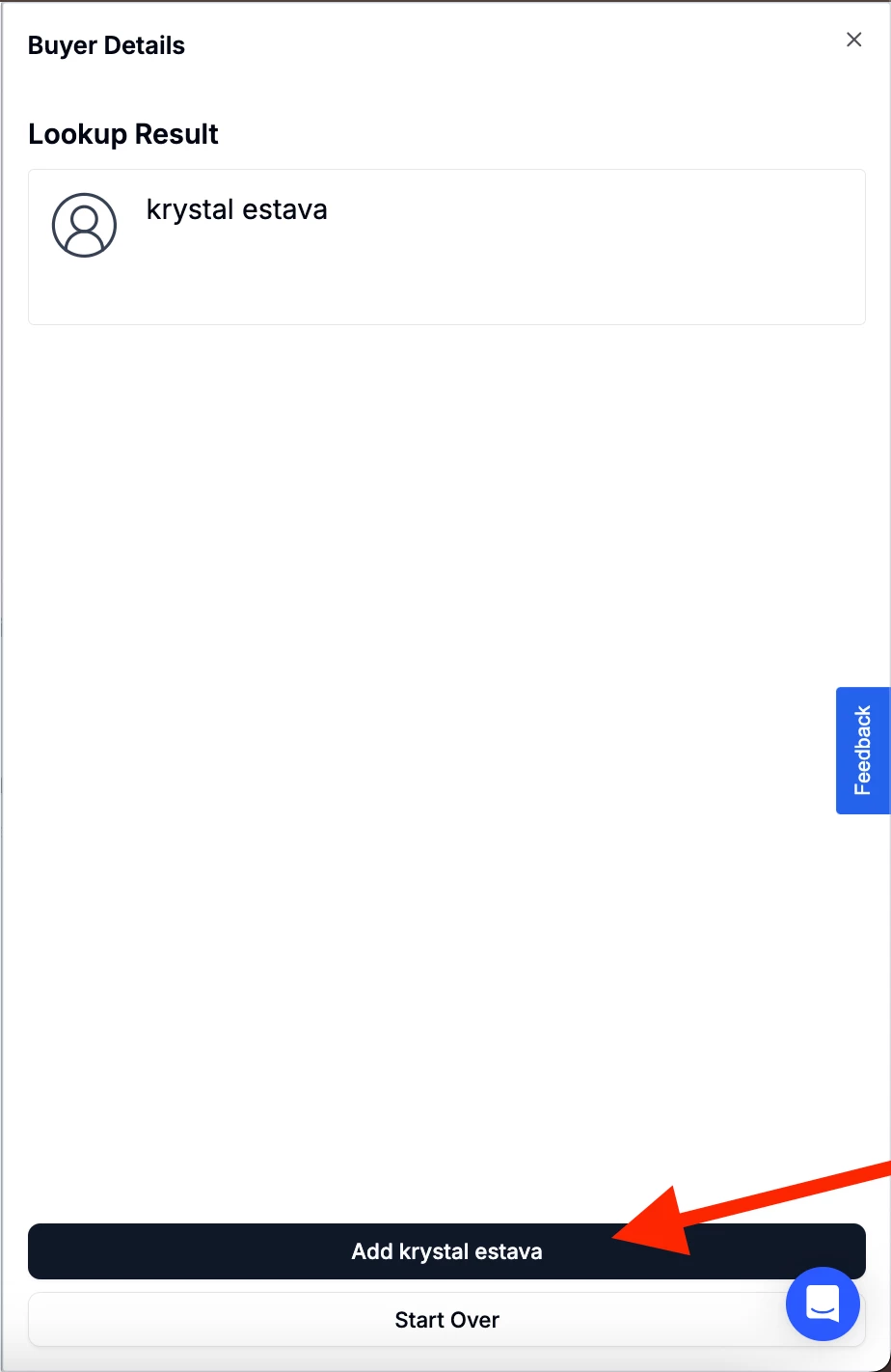 - The buyer will be generated. Click ‘Add *Buyer’s name*’. To go back, click ‘Start Over’.