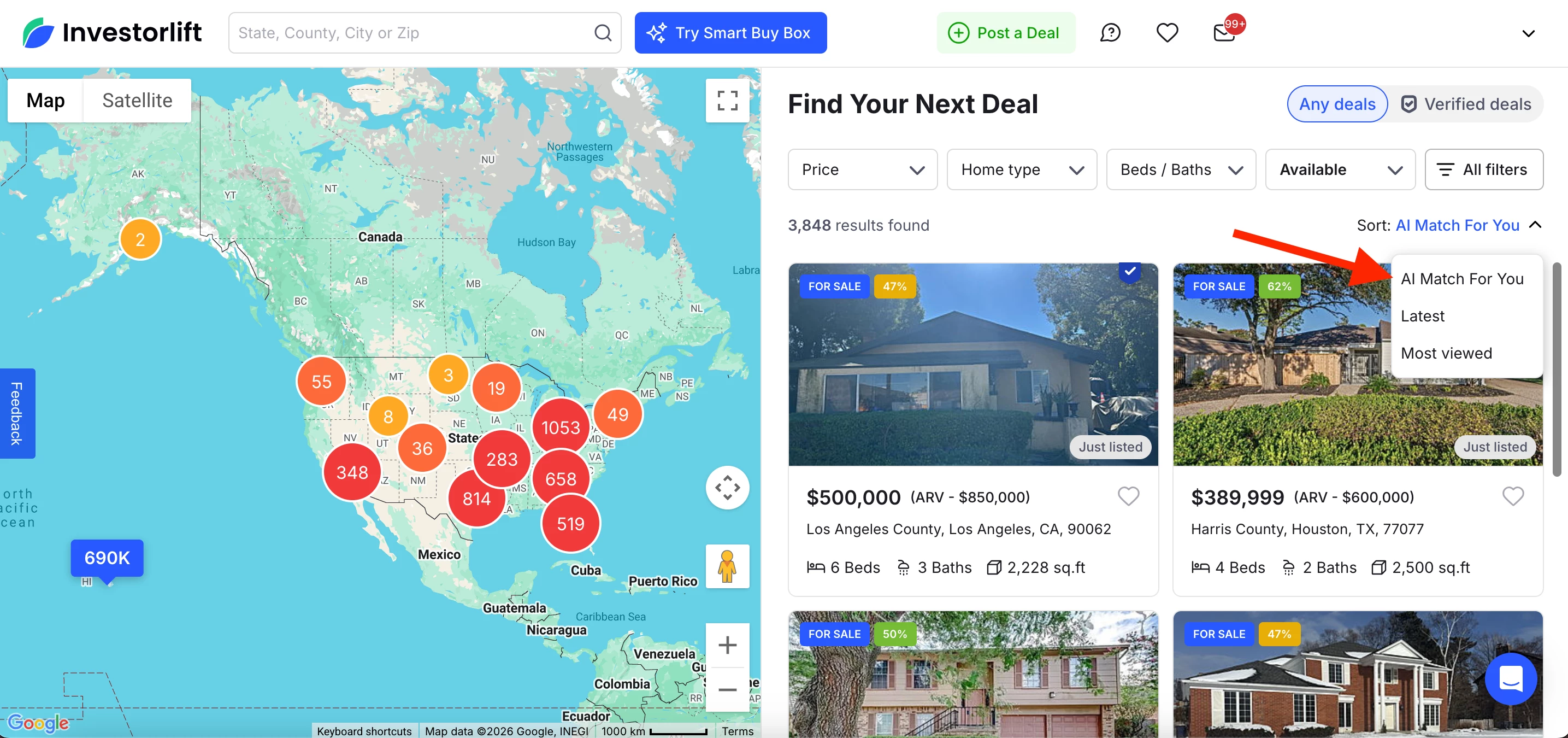 The AI Matches For You is a system that analyzes your preferences, past interactions, and activity on Investorlift to identify and surface the most relevant property deals for you. Whether you're a new investor or a seasoned pro, this feature is designed to help you focus only on the deals that matter to you.