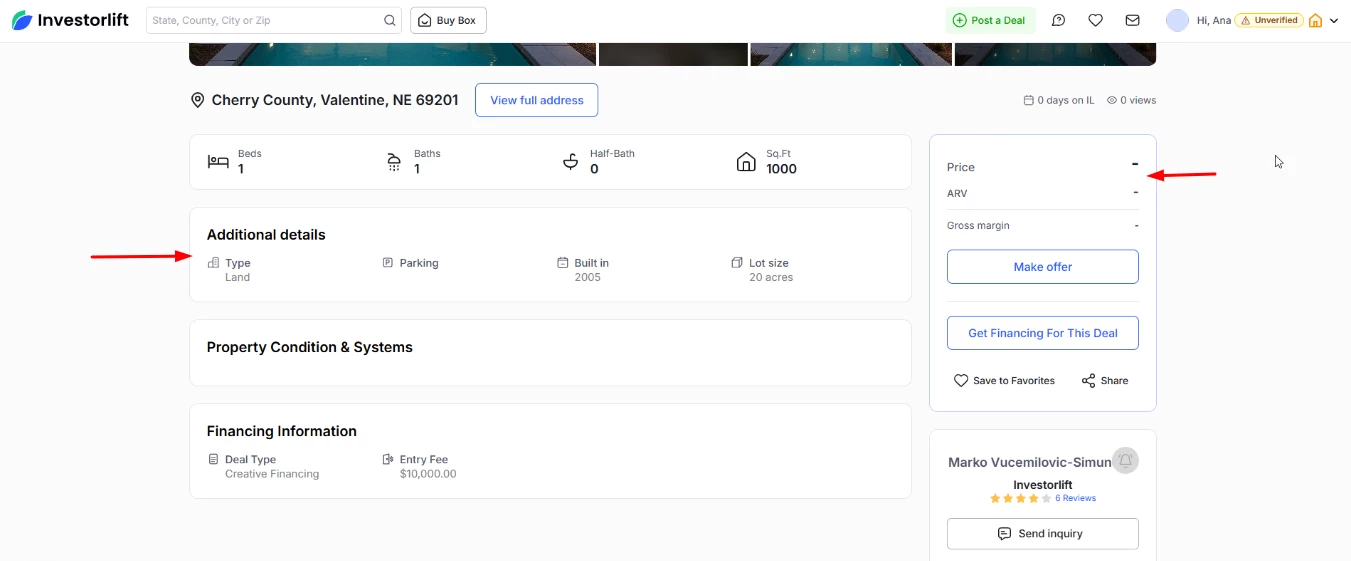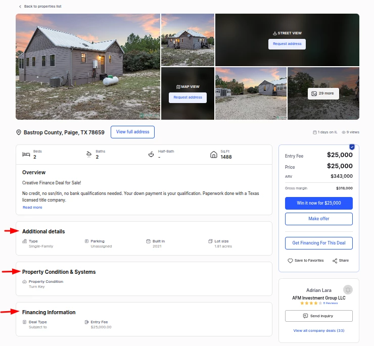 If your deal is listed as Sub2 or Creative Financing, the deal tile will now display the Entry Fee instead of the Starting Price. We also added Interest Rate and Monthly Payment. Ensuring more accurate pricing info for buyers.