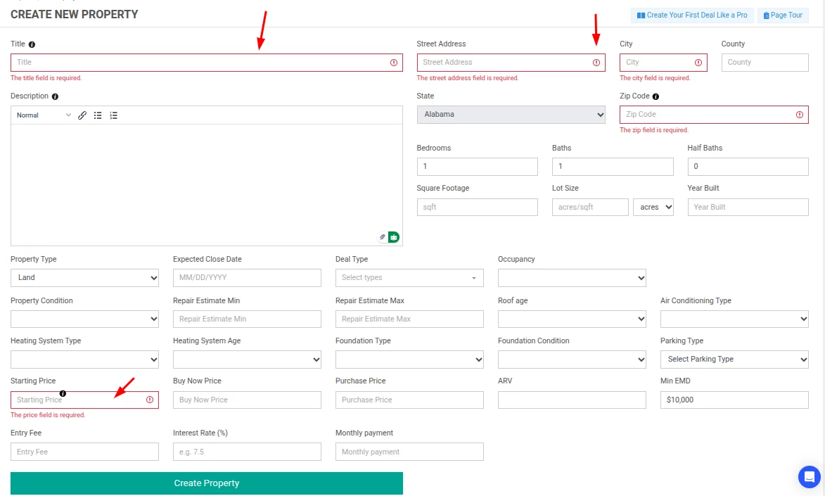 The form now adapts dynamically based on the property type and deal type. For example, when creating a “Land” or “Creative Finance” deal, certain fields automatically become optional, keeping your workflow lean and relevant.